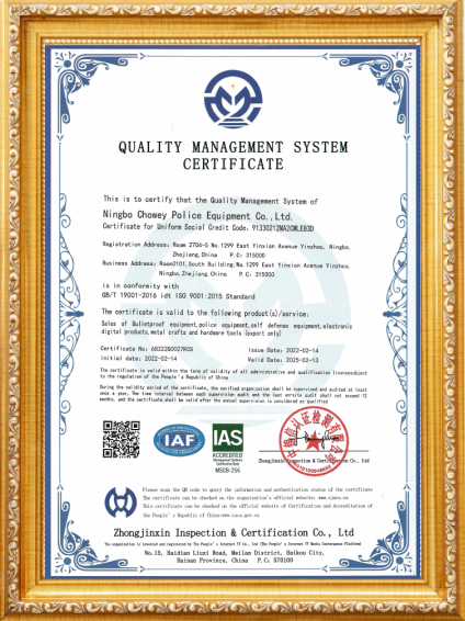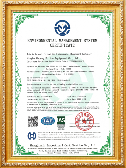 Благодаря строгой и полной системе управления качеством GB / T19001-2016 Idt ISO9001: 2015 Standard и GB / T24001-2016 Idt ISO14001: 2015, каждый продукт соответствует требованиям клиентов к качеству. Кроме того, все наши продукты были тщательно проверены NIJ и другими тестами и проверками перед доставкой.